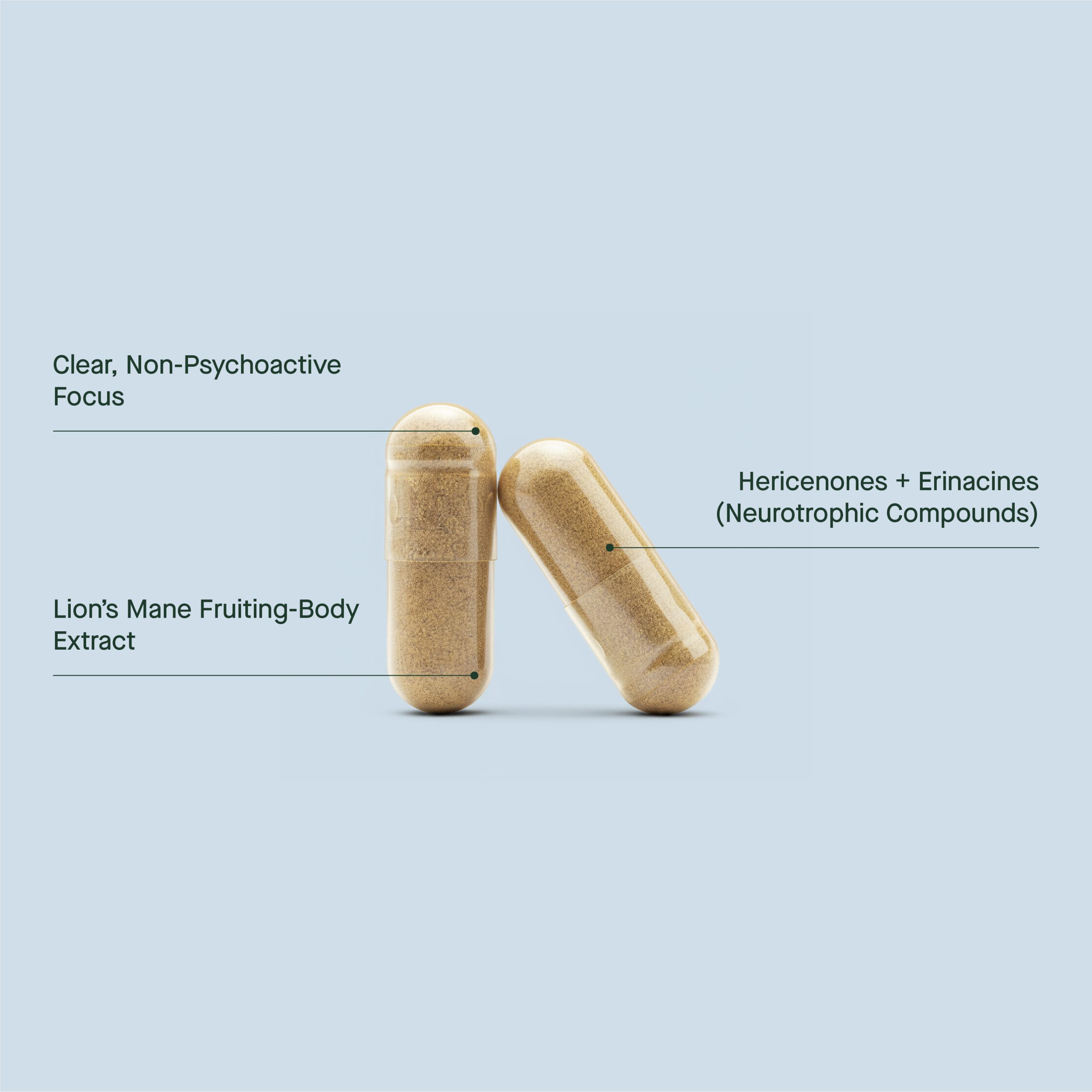 - 530 mg Lion’s Mane 8:1 dual extract (QCE 3120 mg) per capsule